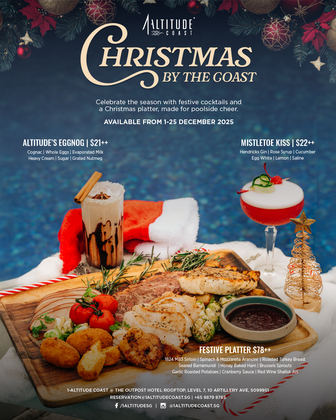 Celebrate the season at 1-Altitude Coast with a festive dining experience by the sea. Indulge in the Festive Platter ($78++), a sumptuous spread of sirloin, roasted turkey breast, seared barramundi, honey baked ham, and all the holiday trimmings — perfect for sharing with loved ones. Complete the celebration with our Christmas cocktails, including Mistletoe Kiss ($22++), a floral gin creation, and Altitude’s Eggnog ($21++), a creamy cognac classic dusted with nutmeg.