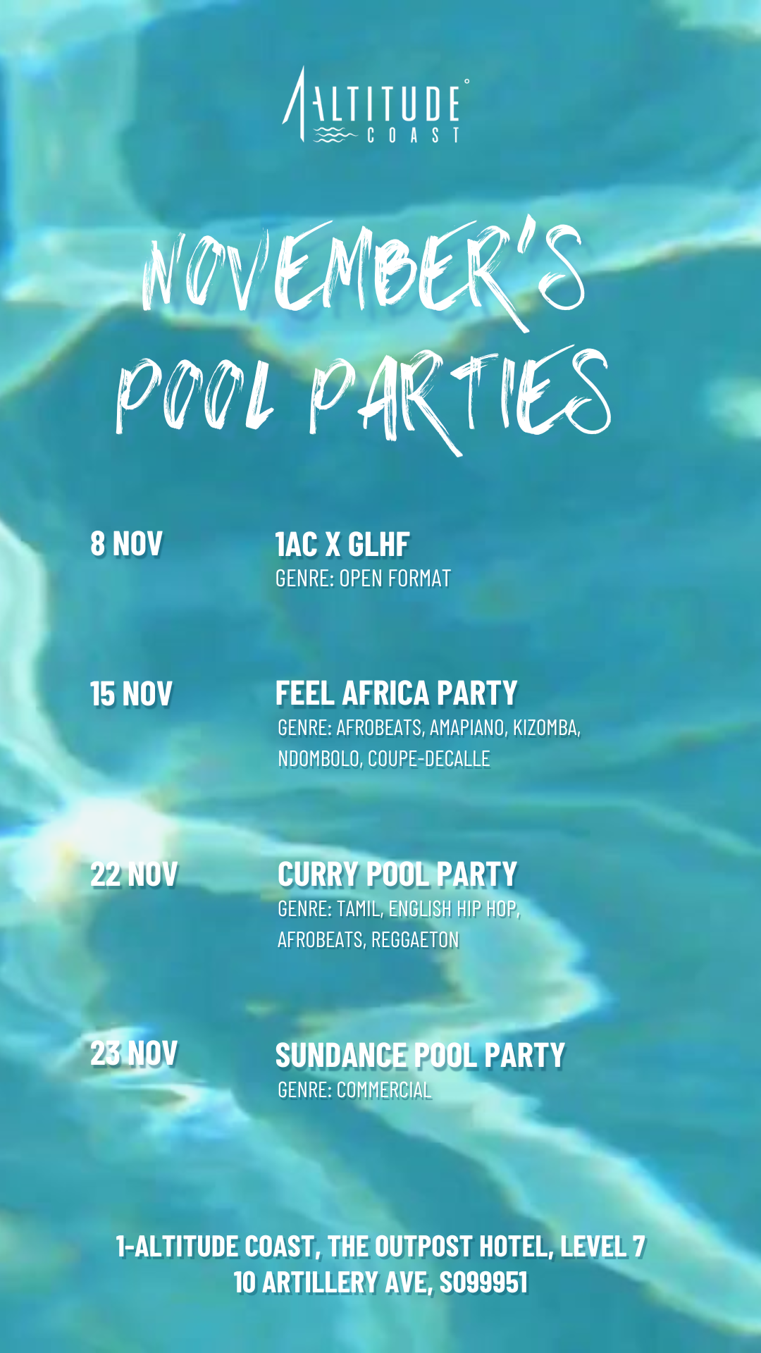 Experience a day-to-night party experience like no other at our Iconic Pool Parties. Imbibe in a selection of cocktails from a cocktail menu that reflects 1-Altitude Coast's island-centric ethos of Fun in the Sun or opt for exciting bottle packages to truly experience Living the High Life, crafted by our talented in-house mixologist. Look out for the different themed pool parties that will be happening monthly to cater to different music genre enthusiasts. Be sure to book your tables early to secure a comfortable table by the pool to party with your entourage at!